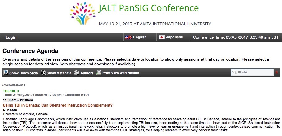 I would like to invite you to my presentation titled “Using TBI in Canada: Can Sheltered Instruction Complement?,” which is taking place at 11:00 AM on Sunday, May 21 in B101 at Akita International University in Japan.